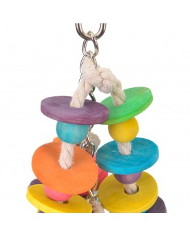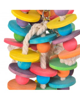 Un'avventura da sgranocchiare. La catena di metallo oscilla avanti e indietro non appena il pappagallo tocca il gioco. Questo rende il gioco una vera sfida. Pezzi di legno colorati, rumori sferraglianti e l'estrema costruzione cinetica di questo gioco per pappagalli lo rendono un'aggiunta meravigliosa a qualsiasi gabbia.